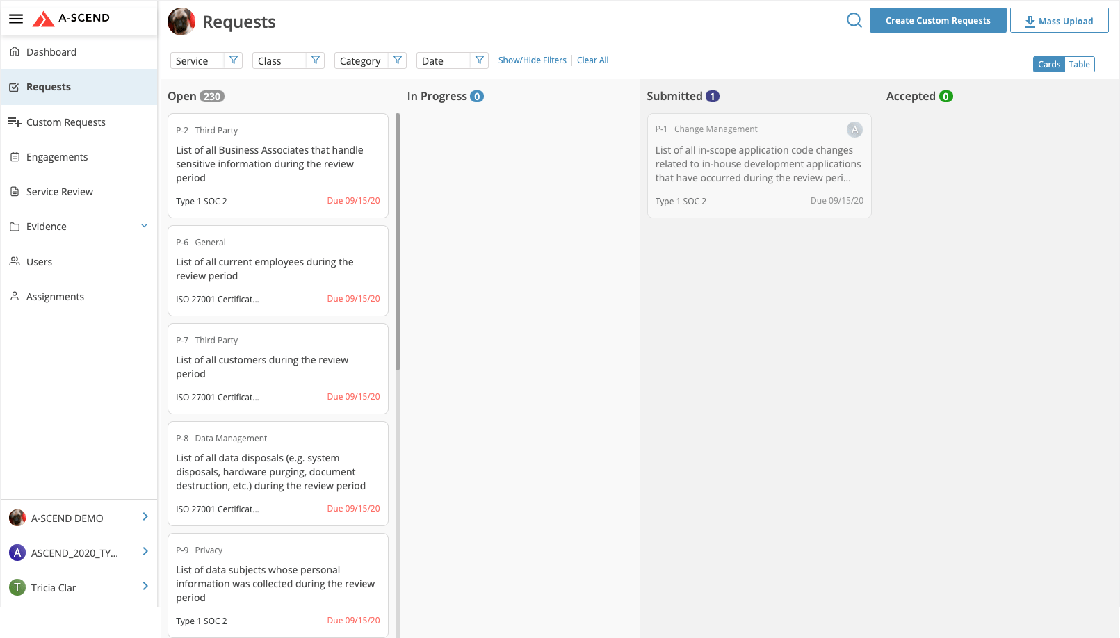 The Kanban/Card view shows individual status of the requests in one view categorized as Open, In Progress, Submitted/Action Required, and Accepted.